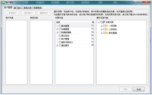 在二級(jí)菜單上點(diǎn)擊【用戶管理】按鈕,彈出用戶管理界面??删庉嫴块T、角色、用戶、角色權(quán)限和用戶權(quán)限。采用樹形結(jié)構(gòu)的管理方式,部門可任意建立(無限級(jí)),部門可以設(shè)置權(quán)限,人員隨便添加到各部門中,人員可以繼承部門的權(quán)限,權(quán)限可以自定義,滿足各種復(fù)雜情況下的權(quán)限管理,在固有權(quán)限中有人員控制設(shè)備的擴(kuò)展功能,不同的人員可以配置控制不同的設(shè)備。