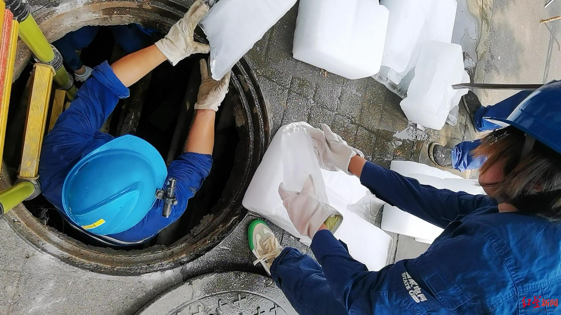 巡檢小隊(duì)正將冰塊放置電纜井底