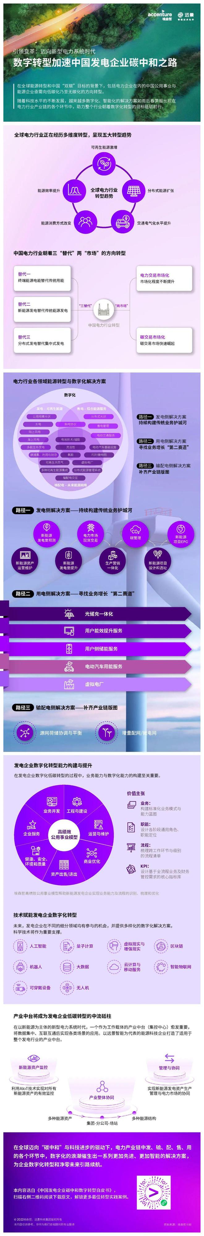 為了應(yīng)對未來更加“碎片化”的能源系統(tǒng),滿足消費者日益迭代的需求,埃森哲攜手遠景發(fā)布的《中國發(fā)電企業(yè)碳中和數(shù)字轉(zhuǎn)型白皮書》勾勒了發(fā)電企業(yè)圍繞發(fā)電、輸配電和用電全產(chǎn)業(yè)鏈構(gòu)建轉(zhuǎn)型路徑,并探討各類數(shù)智化解決方案的應(yīng)用場景。